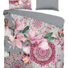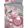 Het Inaya dekbedovertrek antraciet van HIP Collection is een echte blikvanger in de slaapkamer. Op het overtrek zie je prachtige roze magnoliabloemen en frangipani- ofwel plumeriabloemen. Ook zie je roze mandala’s die wel van glittersteentjes gemaakt lijken te zijn. Op de achterzijde van het overtrek vind je een geometrisch lijntjesdessin.