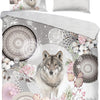 Het Isaci flanellen dekbedovertrek van HIP Collection is een echte sfeermaker in de slaapkamer. Het grijze dessin is versierd met een trendy mix van bloemen, mandala’s en als blikvanger een prachtige wolf in het midden. Tussen de motieven dwarrelen subtiele sneeuwkristallen, wat zorgt voor een dromerige winterse touch. De combinatie van zachte grijstinten en lichtroze bloemen creëert een warme, rustgevende sfeer. De achterzijde is lichtgrijs met een verfijnd patroon, perfect voor een stijlvolle afwisseling.
