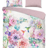 Het kleurrijke Isaye dekbedovertrek van HIP Collection is een echte eyecatcher in de slaapkamer. Het botanische dessin is rijk gevuld met zachtroze, paarse en groene bloemen die prachtig in harmonie zijn, wat zorgt voor een frisse en vrolijke uitstraling. In het midden fladderen twee sierlijke kolibries, die het geheel een speels accent geven. Sla je het overtrek een stukje om, dan ontdek je de roze achterzijde met een verfijnd bloemenpatroon – perfect voor een rustige, evenwichtige touch.