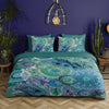 Het Kari dekbedovertrek van HIP Collection tovert je bed om tot een echt kunstwerk. Het groene dessin is rijk versierd met blauwe bloemen in verschillende tinten, gecombineerd met sierlijke mandala’s en elegante pauwenveren. De gelaagde opbouw van de print zorgt voor een speelse, levendige uitstraling. De achterzijde heeft een rustige groene kleur met een subtiel grafisch patroon, ideaal om mee af te wisselen en je bed op verschillende manieren te stylen.