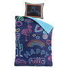De bijpassende kussenslopen maken de set compleet en tonen de tekst "Be Happy" in een stijlvol neonontwerp. Dankzij de handige drukknopen blijft je dekbed stevig op zijn plaats en is het overtrek eenvoudig te verwisselen